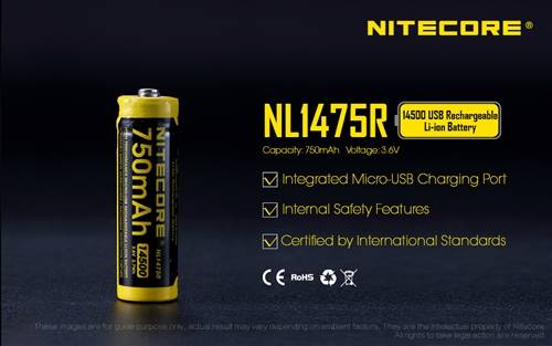 NITECORE NL1475R 750mAh USB Rechargeable 14500 Battery