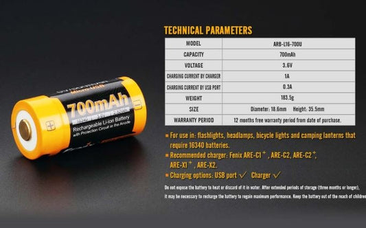 Fenix ARB L16 700U 16340 Built In USB Rechargeable Battery