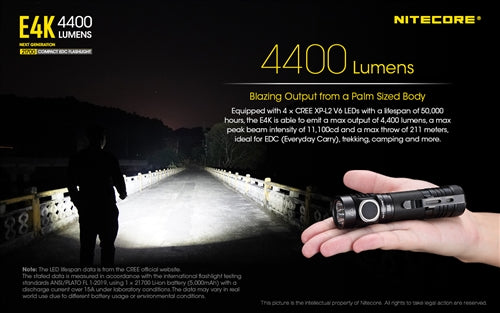 Nitecore E4K 4400 Lumen USB-C Rechargeable Flashlight 1 x 21700 Battery 4x CREE XP-L2 V6 LED