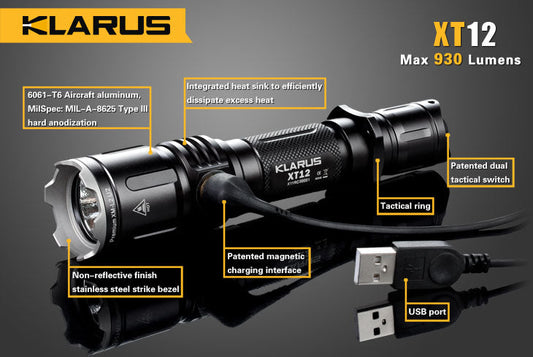 Klarus XT12 1 x 18650 / 2 x CR123A CREE XM-L2 U2 930 Lumen LED Flashlight